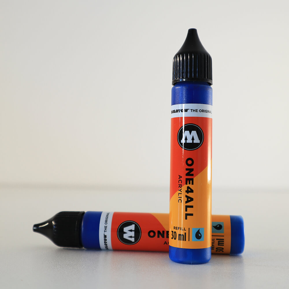 A ONE4ALL™ akril festékkészlete a piac legterjedelmesebb akril színskáláját kínálja. Különösen kitűnik a festék azon tulajdonsága, hogy szinte az összes felületen tökéletesen fed. Nem számít, hogy markerrel, ecsettel, vagy airbursh pisztollyal használják. A színek UV ellenállók. A 30 ml-es újratöltőpalack tökéletes azoknak akik kicsiben szeretnék elkezdeni. Az újratöltő nem csak a ONE4ALL™ markerhez használható, hanem önálló festőeszközként is használatos.